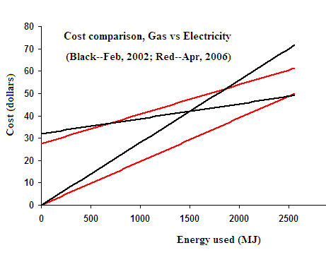 In constructing the graph, the rate for gas was determined from billing information supplied by Shell (winter of 2001), and computed at 0.65 cents/MJ. Although the cost of gas fluctuates (evidently by small amounts) because of variable energy content, this rate is thought to be reasonable for present purposes. Additionally, the 'cover-charge' necessary for gas to flow each month, was taken from the same Shell bill. It comprises two parts, $26 to Atlanta Gas Light Company and $6 to Shell. The value of this cover charge seems to fluctuate, but appears to have been characterized by a secular trend upward for the last two years.